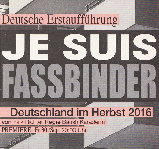 Deutsche Erstaufführung, Deutschland im Herbst 2016 Text: Falk Richter in der Tafelhalle im KunstKulturQuartier, NürnbergPremiere: Fr 30. September 2016, 20:00Uhr Weitere Termine: Sa 01. + So. 02. + Do 13. + Fr 14. Oktober 2016 / Do 23. + Fr 24. + Sa 25. März 2017 (jeweils 20 Uhr / Tafelhalle)