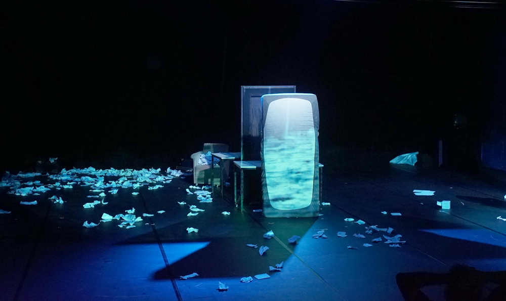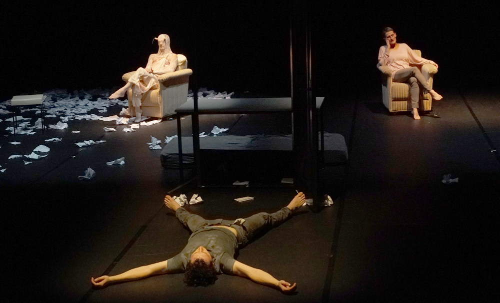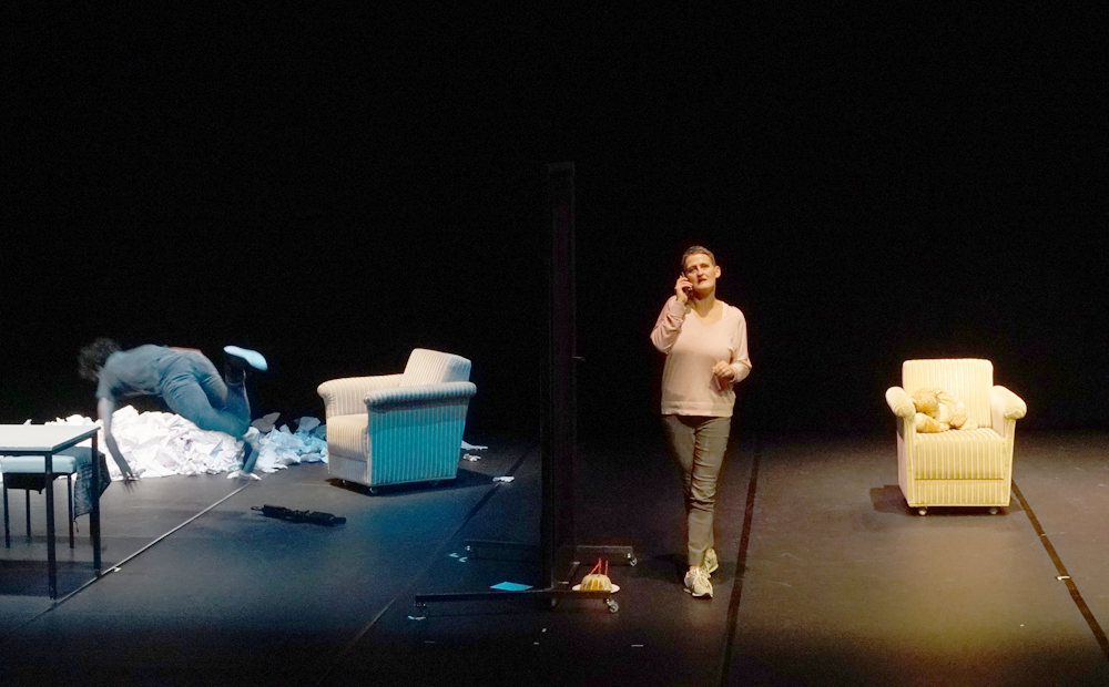 Uraufführung des Theaterstücks "Geburtstag" von Karin Strauß Curtis & Co. – dance affairs CHOREOGRAFIE Susanna Curtis, Curtis & Co. – dance affairs / TEXT Karin Strauß / BÜHNE, KOSTÜME / Johanna Deffner LICHT/ Johannes Volz / VIDEO Miho Kasama