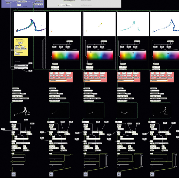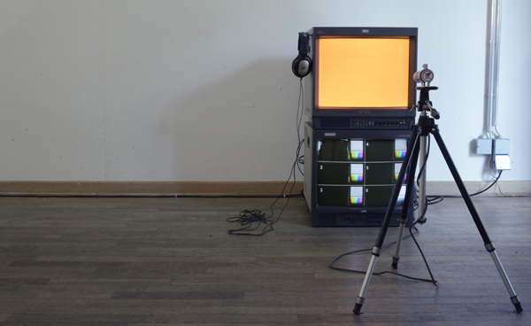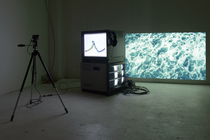 Sound- und Videoinstallation Animation, 5:00 Min., Loop, PAL (DV), 4:3 / Software J-131 /Welle, Video, 1:00 Min., Loop, PAL (DV), 16:9 / zwei Monitore, Mac mini, Webcam, Projektor 2013