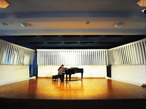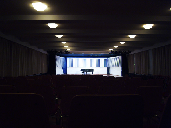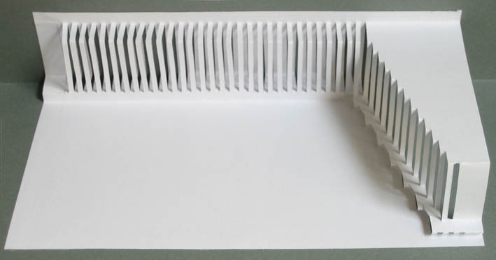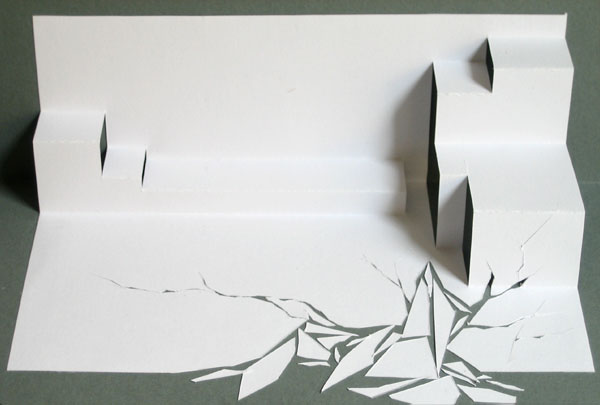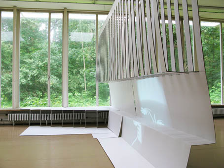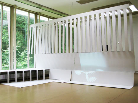 Videoprojektion "Kyu": Pappe, Holz, 5 x 2.7 x 3 m Modell: A4 Papier Bühnebildprojekt "Kunst trifft Komposition": Pappe, Papier, Holz, 10.6 x 8 x 2.8 m 2009